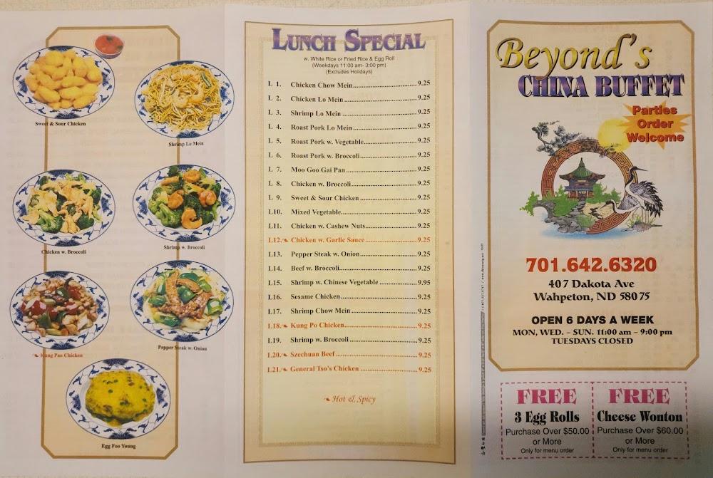 Welcome to Beyond's China Buffet, located in Wahpeton, ND, where a delightful culinary journey awaits! Enjoy a vast selection of authentic Chinese dishes in a cozy, relaxed atmosphere perfect for families, solo diners, and groups alike. With accessible features and ample parking, your visit will be comfortable and enjoyable. Savor our delectable lunch and dinner options, featuring vegetarian choices and endless buffets. Whether you choose to dine in, take out, or have it delivered, we prioritize fresh, quality ingredients at affordable prices. Experience the warmth of our friendly service and indulge in our extensive tea selection. Discover your new favorite dining spot today!
