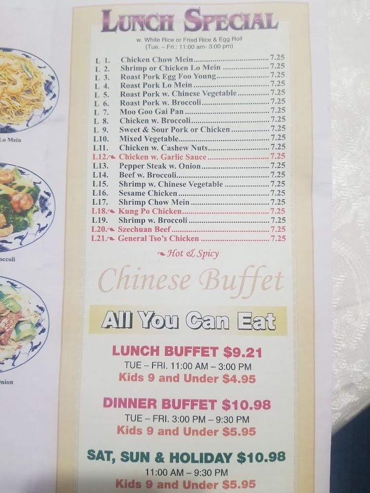 The menu boasts an impressive array of approximately 46 different dishes. It features a variety of flavorful options across several categories. Highlights include chicken chow mein and the happy family dish. Vegetarian selections cater to diverse tastes. Side orders like fortune and almond cookies are also available. Each plate showcases familiar yet delicious Chinese flavors. The all-you-can-eat format encourages diners to explore different flavors. Fresh ingredients remain a staple, making each meal enjoyable. Overall, the menu fits well within the price range of $10 to $20.
